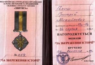 ВГО «Спілка ветеранів та працівників силових структур України» «ЗВИТЯГА» нагородила директора наукової бібліотеки ім. М. Максимовича Черкаського національного університету ім. Б. Хмельницького, кандидата історичних наук, доцента, члена Національної спілки журналістів, почесного краєзнавця України Голиша Григорія Михайловича медаллю Спілки «За збереження історії». ВІТАЄМО!