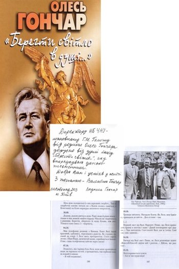 Під завісу 2013-го мені принесли невелику посилочку з Києва і я, прочитавши імена відправників, очам своїм не повірив: її мені надіслала родина Олеся Гончара. Так, так, саме того нашого недавнього сучасника, великого достойника й духовнотворця, прозаїка від Бога, котрого з повними на те підставами називали совістю української літератури. У поштовій оказії виявилася гарна книжечка з адресованим мені дарчим підписом від дружини та доньки покійного письменника. Зрештою, я пригадав обставини, які й стали джерелом такого приємного сюрпризу. Якось на одній із книжкових презентацій, що близько року тому проходила в головній книгозбірні країни – Національній бібліотеці ім. В. Вернадського – я зустрівся з пані Людмилою Гончар (донькою літературної знаменитості), яка повідомила про завершення роботи зі впорядкування батькових щоденників та наступний вихід у світ відповідного видання. Без особливої надії таки сподіваючись, я попрохав Людмилу Олександрівну при нагоді й мене ощасливити своїм публіцистичним дітищем. І таки звершилося!